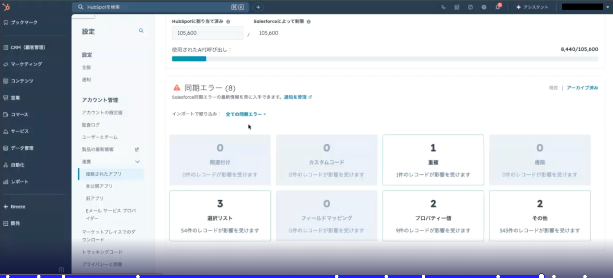 Salesforce連携アプリでHubSpotに移行する際、データ量や設定内容により同期エラーが発生する場合もあります。例えば、同期エラーが発生すると下記の画面のようにエラー内容が表示されます。