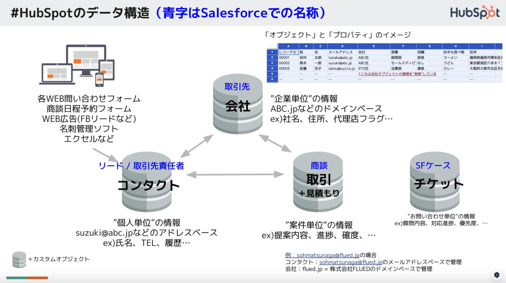 両ツールは同じ顧客情報を扱っていても、項目名(フィールド)やデータの管理構造が異なる点に注意が必要です。SalesforceとHubSpotでは、同一の情報であっても、呼び方や紐付け方が以下のように異なります。