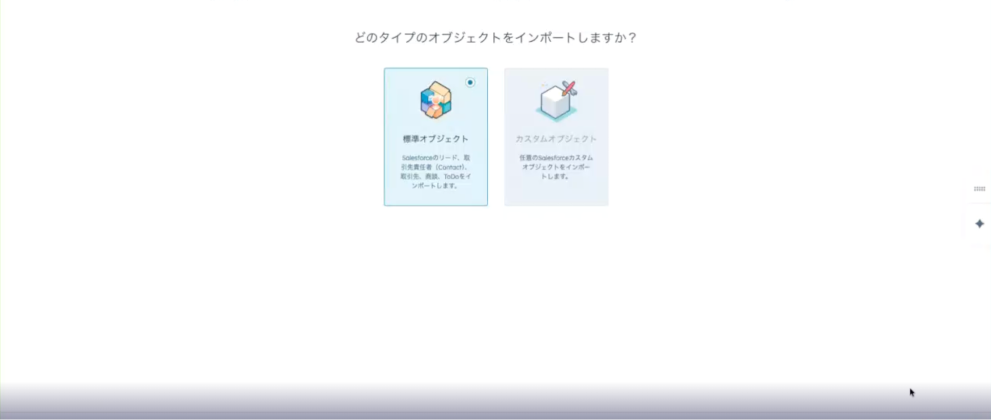 Salesforce連携アプリをインストールしてセットアップしただけでは、データは自動でHubSpotに移行されません。セットアップ完了後に、インポート機能を使ってデータを取り込む必要があります。