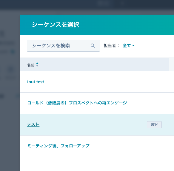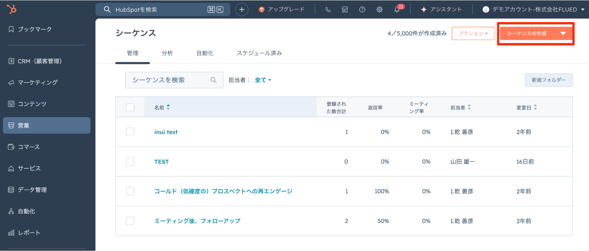 HubSpotのメニュー「営業」>「シーケンス」からシーケンス作成画面にアクセスします。
