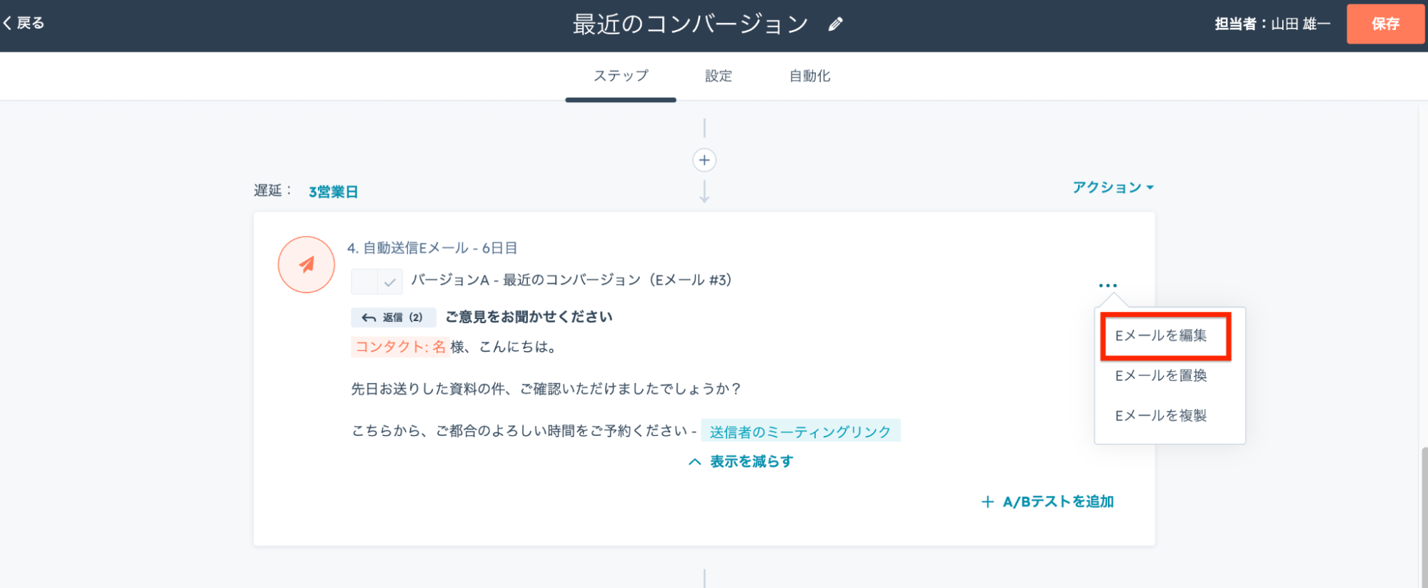「3営業日後」に自動で次のEメールを送るステップを追加します。以下のように「先日お送りした資料の件、ご確認いただけましたでしょうか?」といった内容です。