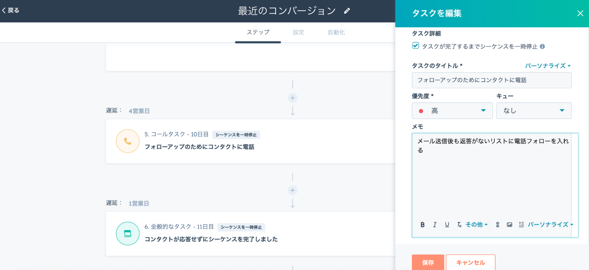 メール送信後も返答がない場合に備え、さらに数日後に電話フォローのタスクを自動作成するステップを組み込みます。