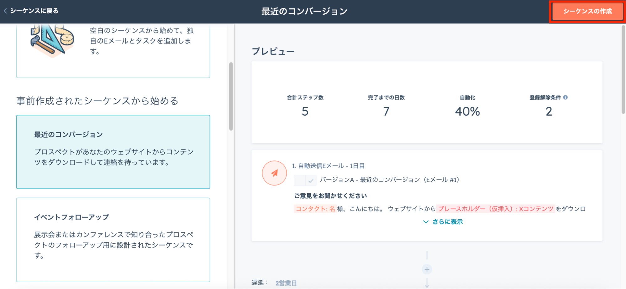 今回はすでにシーケンスがすでに作成されている「最近のコンバージョン」を選択します。選択した状態で、右上にある「シーケンスの作成」をクリックしてください。