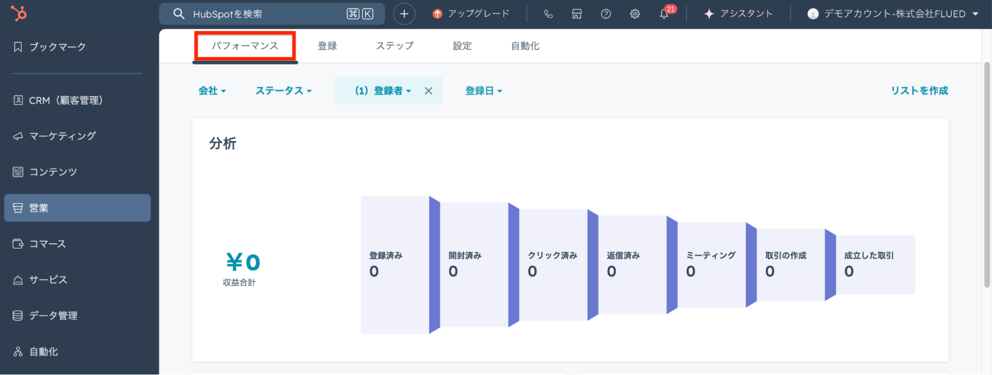 HubSpotのシーケンス分析画面では、開封率やクリック率、返信率、ミーティング予約率といった成果指標を一覧で確認できます。