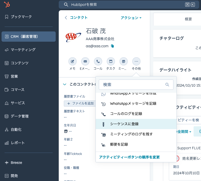 CRM(顧客管理)からコンタクトを開き、その他を選択すると、シーケンスの登録が可能です。